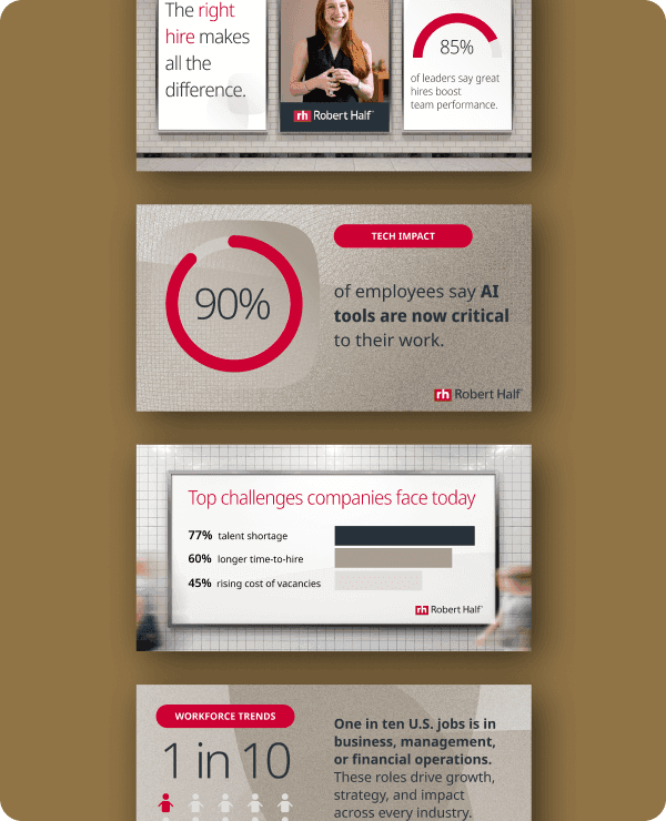 Judy was instrumental in helping global talent solutions company Robert Half through the branding and creative design for an international rollout of our employee value proposition. She was responsible for executing the development of hundreds of assets, while working closely with partners in Corporate Communications and Human Resources, as well as project managers. She's super talented, and I have enjoyed collaborating with her.