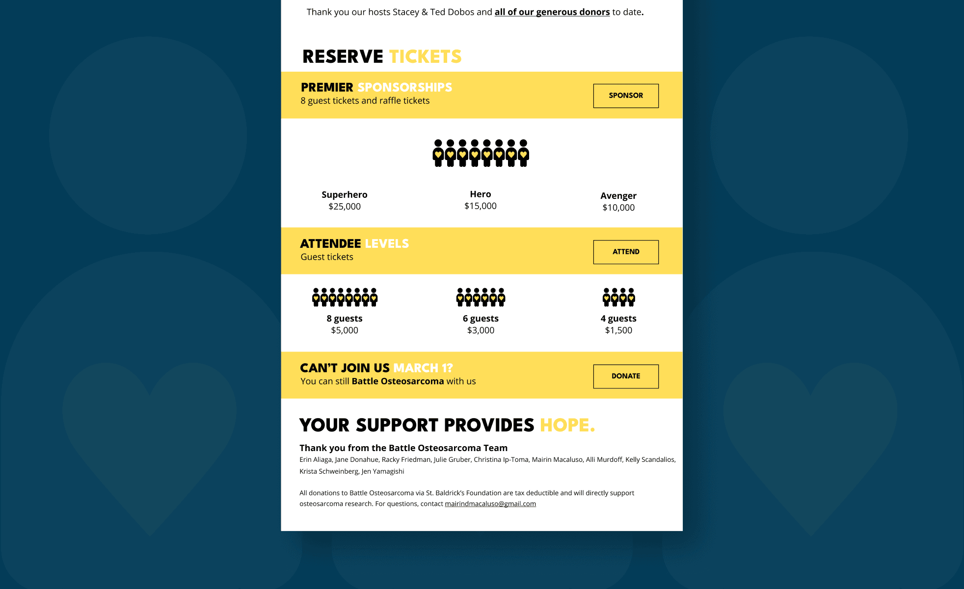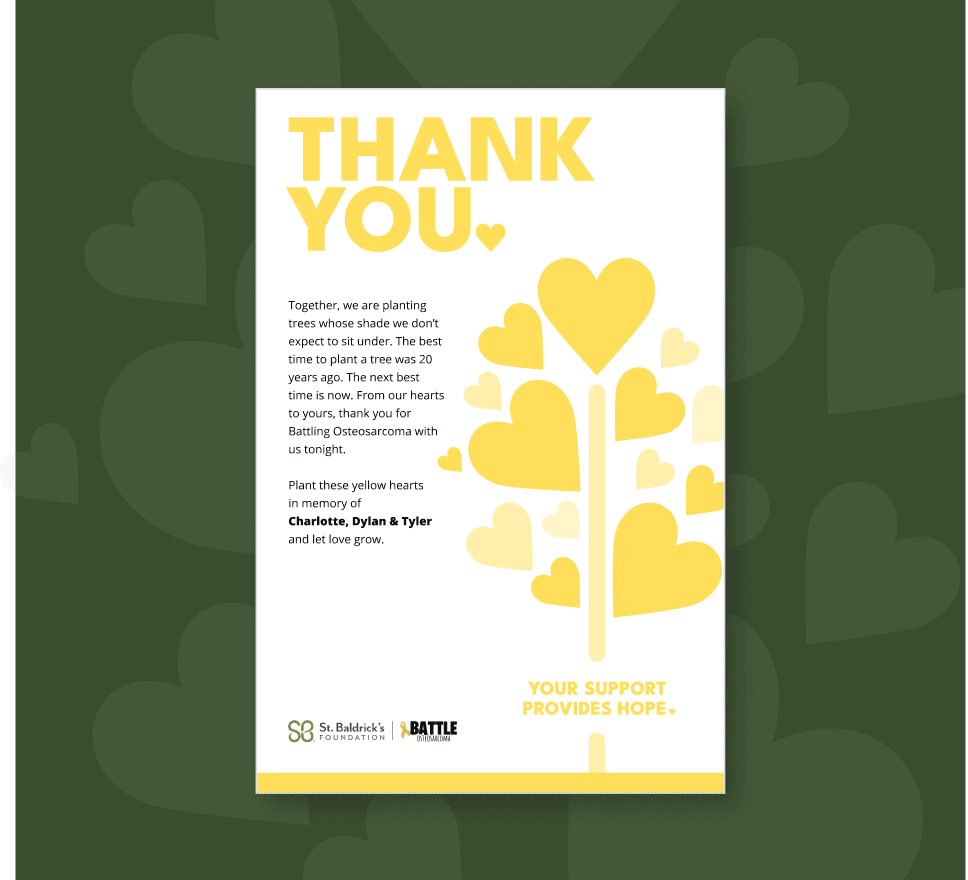 Battle Osteosarcoma needed a cohesive visual identity for multiple fundraising events and a website, but had no formal brand guidelines. Their requirements included incorporating the color yellow, a heart motif, and photos of three children whose memory inspired the organization. Deliverables had to resonate emotionally with donors while being practical for non-technical staff, and timelines were tight—especially for the website launch before the benefit concert announcement.